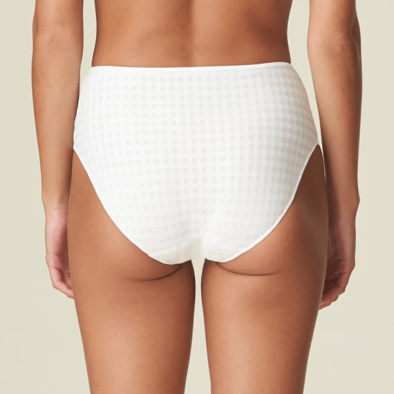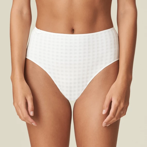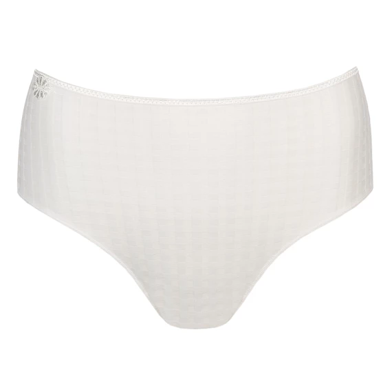 Der Avero Taillenslip von Marie Jo in der Farbe Natur. Dieser cremefarbene Slip ist ein schöner Kompromiss zwischen Eleganz und Tragekomfort.Dank des hohen Bündchens wird der Bauch bedeckt. Der Slip an der Seite mit einer Blume verziert.