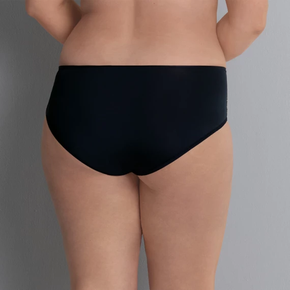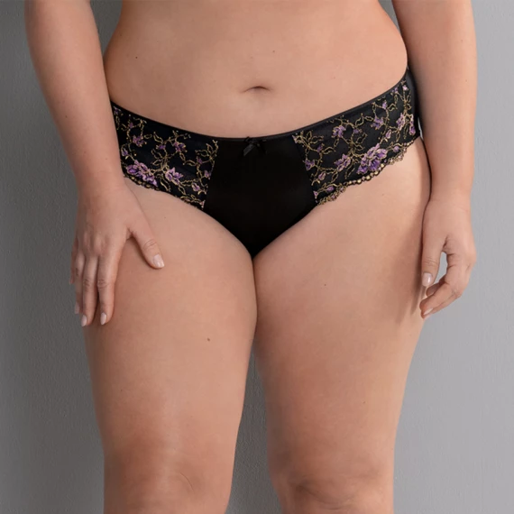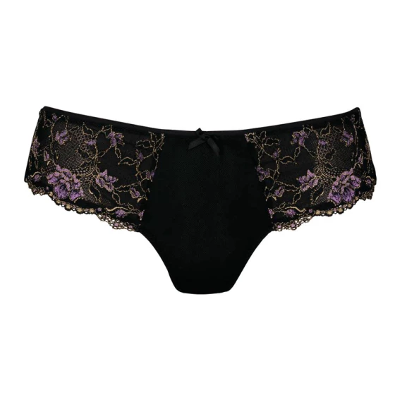 Der Colette Slip von Rosa Faia ist in der Farbe Schwarz erhältlich. Der Slip ist mit der gleichen feinen Blumen Stickerei in den Farben Lila und Gold versehen wie der Colette BH. Die Rückseite besteht aus einem weichen Mikrofasergewebe.
