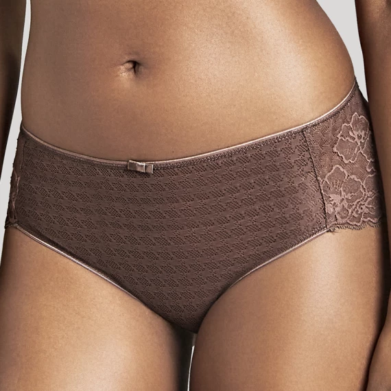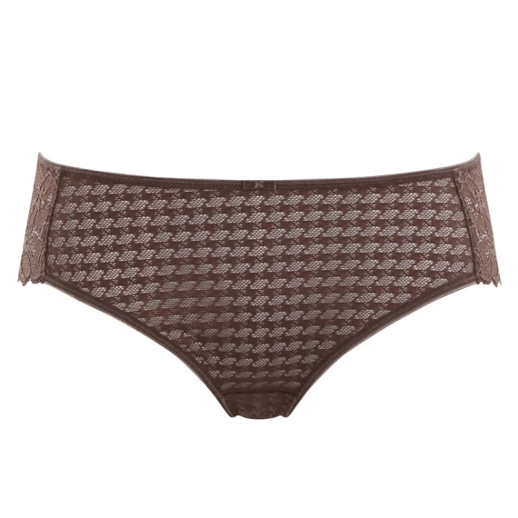 Der Envy Slip von Panache ist in der Farbe Chestnut erhältlich. Dieser braune Slip ist aus festem Material mit gewebtem Pied-de-Poule-Muster gefertigt. Die Ausschnitte an den Beinen sind seitlich und hinten elegant mit elastischer Spitze verarbeitet. Auf der Vorderseite befindet sich eine niedliche Schleife, die diesen Slip vervollständigt!