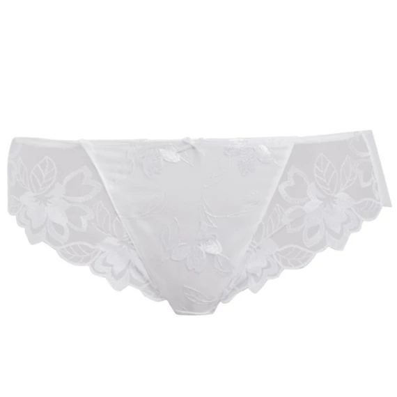Der Leona Slip von Fantasie in der Farbe White. Dieser weiße Slip ist an der Vorderseite mit einer Blumenstickerei verziert. Die Hinterseite ist aus einem weichen, glatten Geweben, wodurch der Slip einen hohen Tragekomfort hat und unter enganliegender Kleidung nicht abzeichnet.
