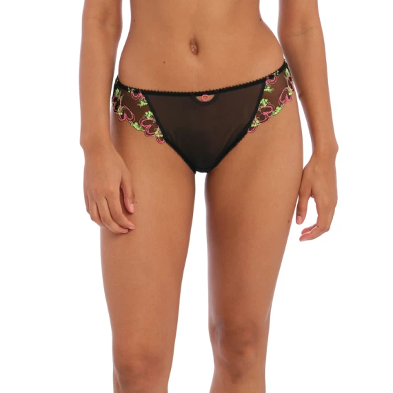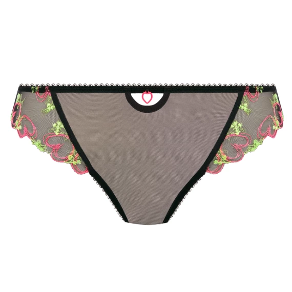 Der Loveland Slip von Freya ist in der Farbe Schwarz erhältlich. Dieser schwarzer Slip ist ein echter Hingucker! Die Seitenteile des Slips sind mit einer schönen Stickerei aus bunten Herzen und Blumen versehen. Die Rückseite des Slips ist mit einem einfarbigen Stoff versehen. In der Mitte der Vorderseite ist ein rosafarbener Anhänger in Form eines Herzens verarbeitet, um den Slip zu vervollständigen!