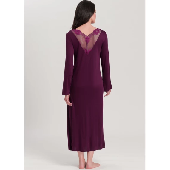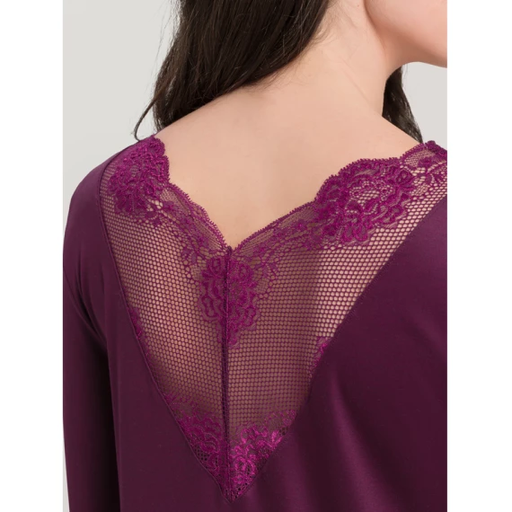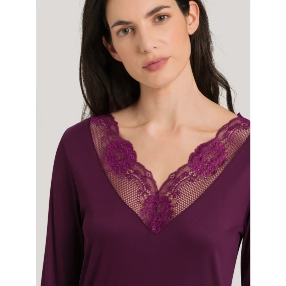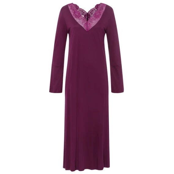 Het Lovis nachtjurkje van Hanro is uitgevoerd in de kleur Sumac. Het paarse effen jurkje heeft een V-hals. Het nachtjurkje is voorzien van prachtige kanten versieringen bij de hals en op de rug. Het model valt tot aan de enkel en heeft lange mouwen. Perfect om een heerlijke nacht tegemoet te gaan!