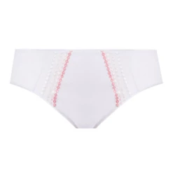 Der Matilda Slip von Elomi in der Farbe Weiß. Dieser Slip ist in der Mitte aus einem robusten Stoff gefertigt. Die Seiten und die Rückseite bestehen aus einem elastischen, durchscheinenden Stoff. Die Vorderseite des Slips zieren kunstvolle Polkadot-Stickereien.