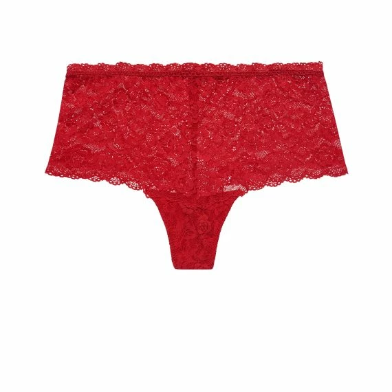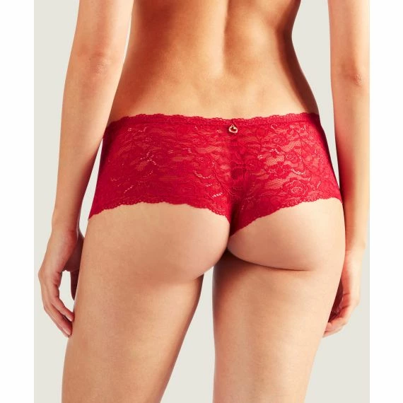 Die Rosessence Shorts von Aubade ist in der Farbe Gala erhältlich. Diese roten Shorts bestehen ausschließlich aus sexy, transparenter Spitze mit einem subtilen Blumenmuster. Auf der Rückseite befindet sich ein goldenes Detail mit einem verarbeiteten Swarovski-Stein.