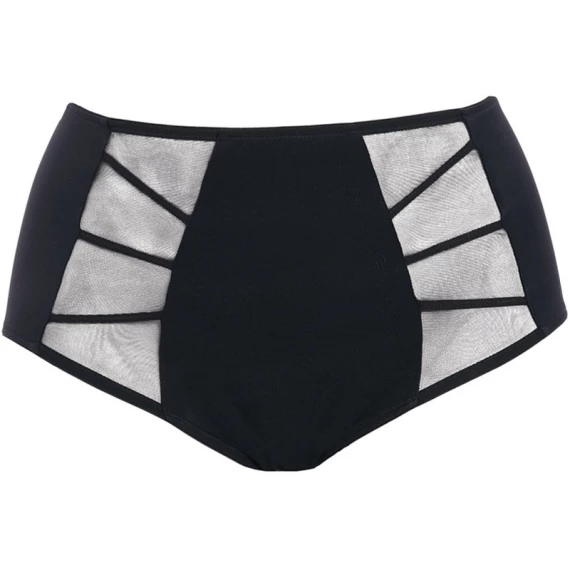 Der Sachi-Taillenslip von Elomi in der Farbe Black. Auf der Vorderseite ist der Slip mit Streifen aus schwarzem und leicht transparentem Stoff versehen. Diese Streifen zieren verspielte Bänder für einen sexy Look.